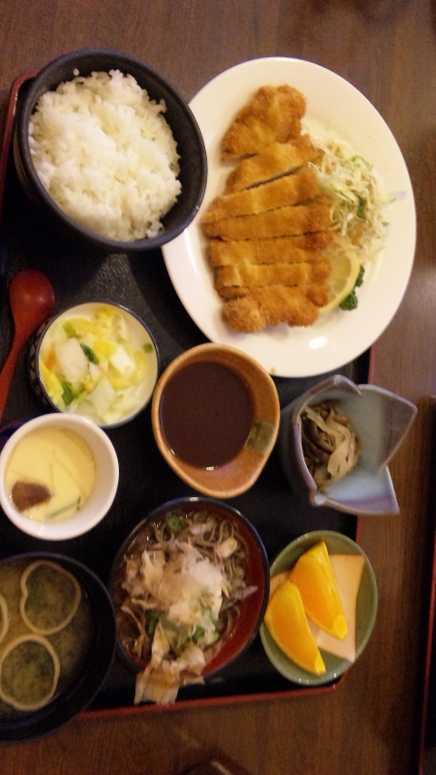 ランチメニューで豚カツランチ1100円でございます。おろしそばもついててボリュームタップリです